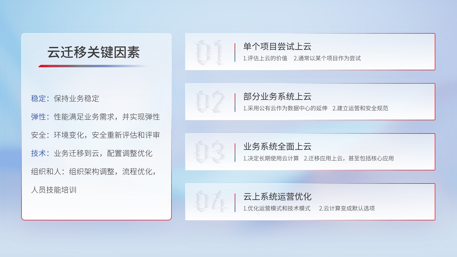 结合实际业务,,从规划设计、、、云平台选型、、、、云原生改造、、、数据迁移、、集成交付,,迁移全过程为客户识别最佳上云路径,,,做好风险识别管理,,设计网络架构、、身份权限、、、、安全审计合规、、操作审计、、、、日志审计、、、监控告警策略、、、、多站点容灾设计等,,,对云上基础设施进行整体规划,,提升IT治理水平,,,,以满足弹性、、、高可用、、、高性能的需求。。。